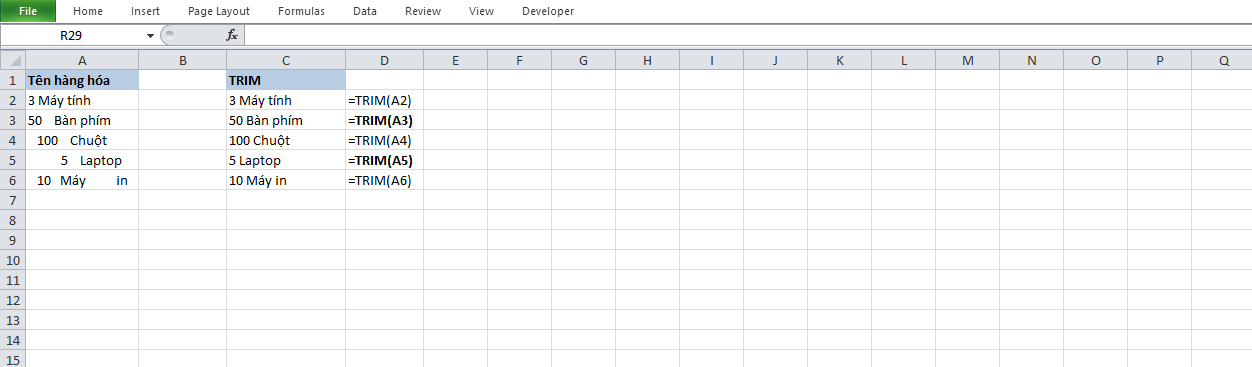 Nó sẽ loại bỏ tất cả các khoảng trắng thừa trong các ô ngoại trừ một ký tự khoảng trắng giữa các từ: